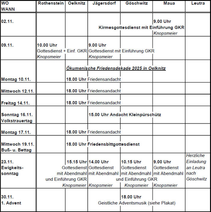 Ökumenische FriedensDekade 2025in der Kirche Oelknitz mit Friedensandachtenjeweils um 18:00 Uhr:Montag, 10.11. , Mittwoch 12.11., Freitag, 14.11., Montag, 17.11.und einemFriedensbittgottesdienst:Mittwoch, 9.11. Buß- und Bettag 18:00 Uhr